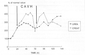 creatine rose to values of 88 and 3.3 mg/dl respectively (Fig. 8). With CAVH, we